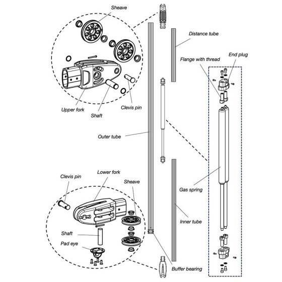 Rodkicker Type 05S is recommended for masthead rigged yachts with a displacement of max 3,9 tonnes and fractional rigged yachts up to 2,5 tonnes. 058-036-05 does not include a gas spring so the main purpose with this rigid vang is to facilitate sail handling when reefing, preventing the boom from dropping into the cockpit or onto the coach roof. It also doubles the purchase of your kicking strap. Kicking strap is not included. It can easily be upgraded with a gas spring if required. When fitted with a Seldén gas spring, it lifts the boom when the kicking strap is released. Excellent for trimming the main in light air. The right size of Rodkicker, and correct spring force, is determined by the displacement of the boat, the righting moment at 30° heel angle, the boom height above deck, the length of the boom (E-measurement) and whether the mast is of conventional type or a furling mast. All of this is thoroughly explained on Seldén's website.